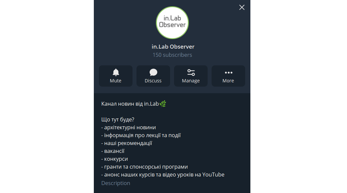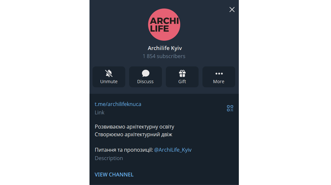 Канал новин, де ми ділимося архітектурними новинами, інформацією про лекції та події, вакансіями, конкурсами, грантами, спонсорськими програми та іншими власними рекомендаціями. Наш, і, відповідно, наполегливо рекомендуємо =)