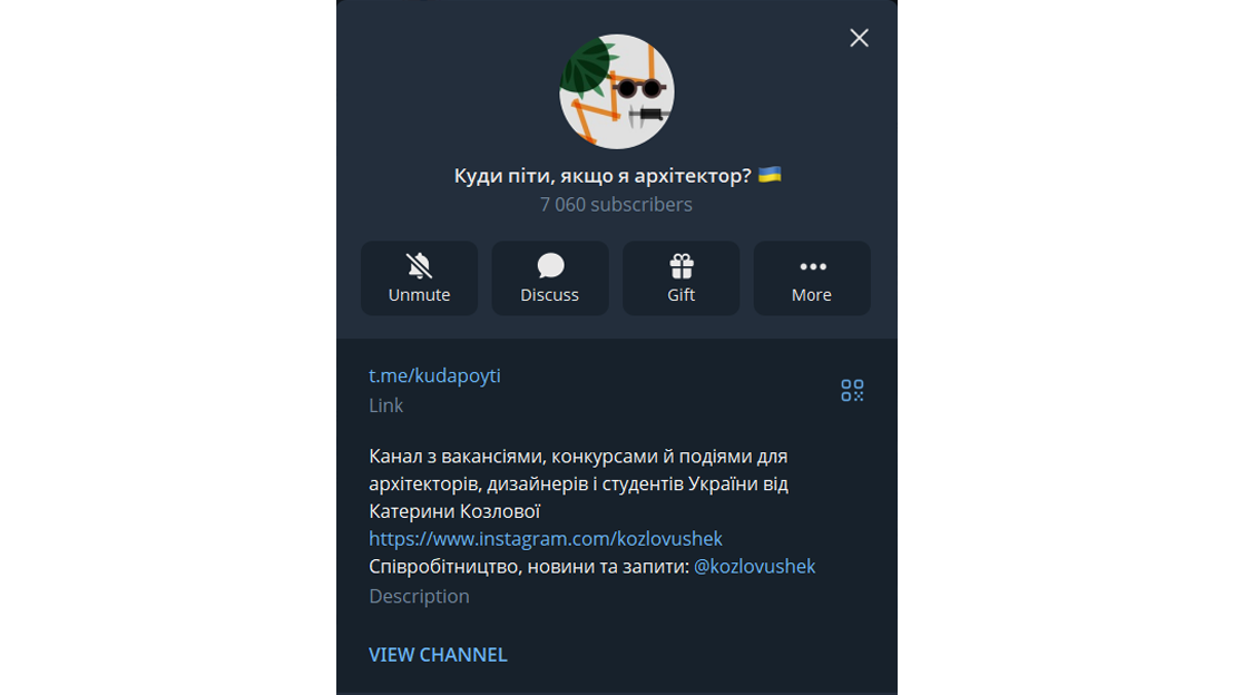 Здається, найпопулярніший в Україні канал з вакансіями, конкурсами й подіями для архітекторів, дизайнерів і студентів України від Катерини Козлової.