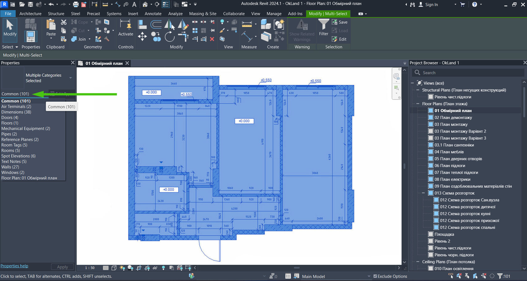 2. 🍃На обмірному плані виділяємо всі об'єкти й у "Properties" – "Common" (Властивості) бачимо перелік всіх елементів та їх кількість. Далі по черзі перемикаємо категорії елементів (Стіни/Вікна/Двері тощо) та призначаємо їм стадію "Existing" (Існуючі) у розділі властивостей "Phasing". До стадії існуючих визначаємо все, що маємо на початок роботи над проєктом.