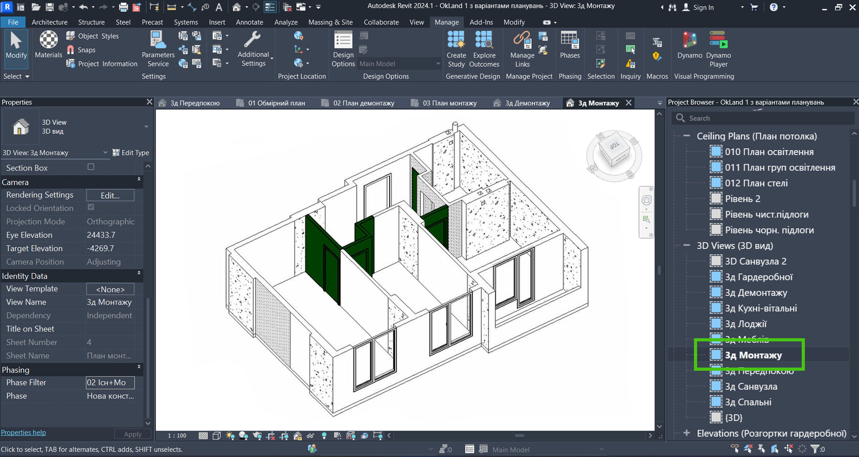 - Властивість "Фільтр стадій" дозволяє керувати відображенням елементів на видах. Наприклад, знесені стіни – червоні, нові – зелені.