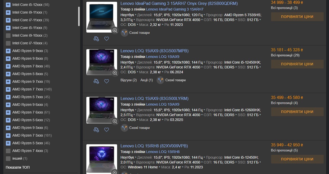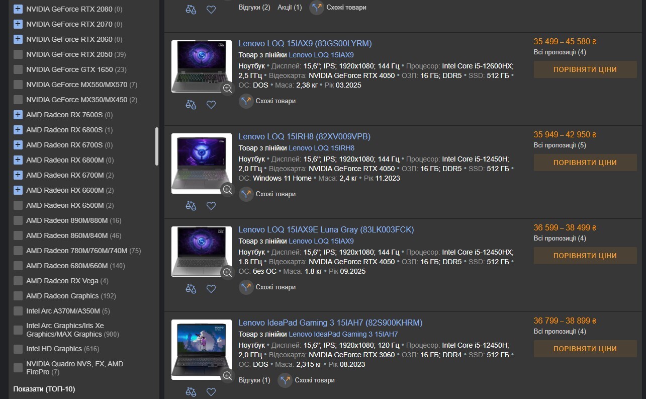 На скріншоті я відмітив ті, які справді варто розглядати. Інші, що нижчі за цифрами в назвах, — не беріть: вони старі або слабкі. А все, що ми обрали, нормально пропрацює щонайменше два роки.