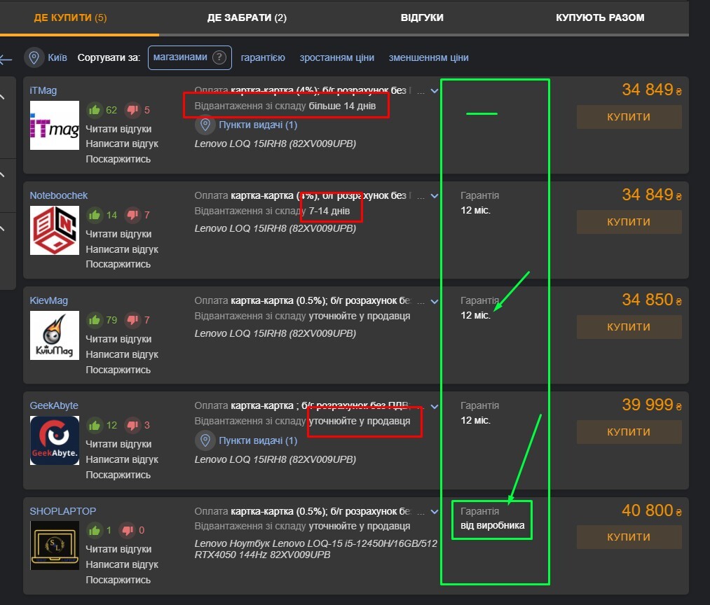 Ноутбук — техніка не дешева, тому треба обрати магазин, який дасть гарантію і не зникне через день. Краще купувати у відомих рітейлерів, а якщо там суттєво дорожче — почитайте відгуки про менші магазини й зважте всі нюанси: де вони знаходяться, яка форма оплати, від кого гарантія тощо.