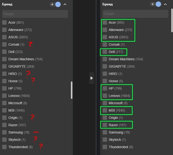 На картинці червоним позначені ті бренди, про які я нічого не знаю, а зеленим — ті, які тестував особисто або чув хороші відгуки від знайомих користувачів.