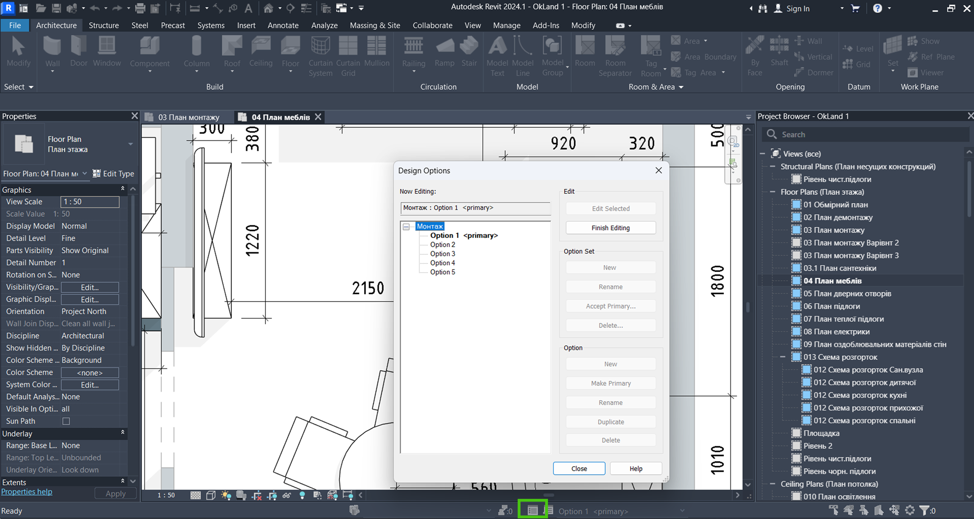 Як зазвичай у цьому випадку діє більшість проєктувальників? — Вони копіюють модель. Ну а ми цінуємо свій час, тому доручаємо цю роботу Revit з його зручним інструментом "Design Options" (Варіанти конструкції) — це колекція можливих рішень для певної задачі проєктування. Кожен набір варіантів містить один основний та один або кілька другорядних варіантів.