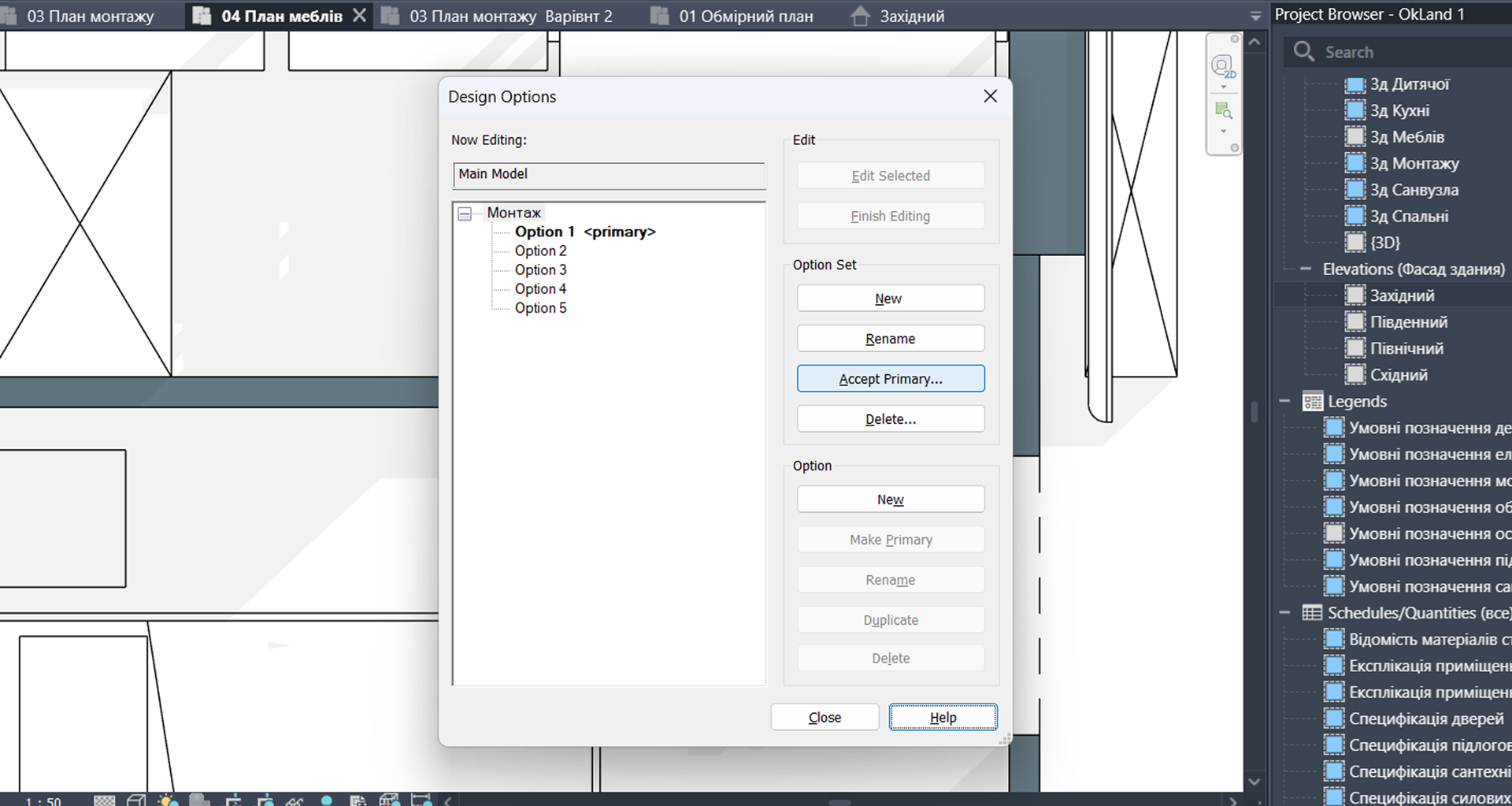 Коли замовник обрав відповідний варіант, його можна внести до Головної моделі, тобто — "Finish Editing" (Завершити редагування) та "Accept Primary" (Прийняти основний).